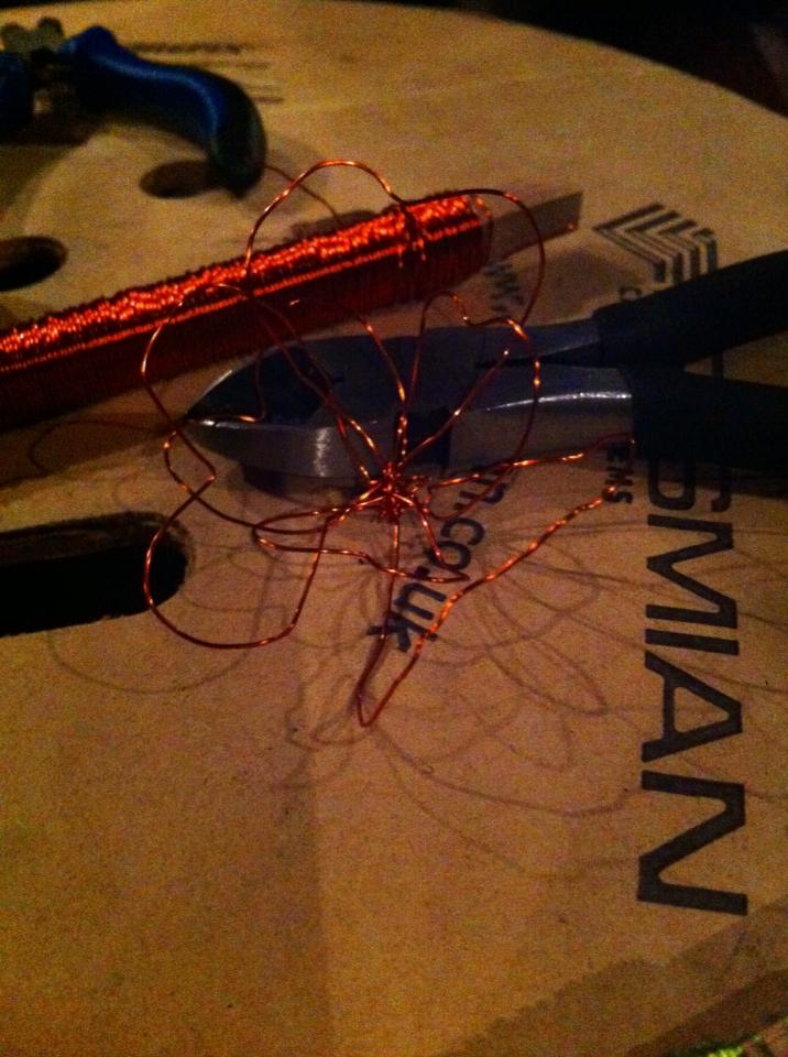 Afterwards someone discarded their wire and said I could have it. They had worked it into a red ball with a multi-coloured tail, which they clearly thought wasn’t useful. But no, this became the flower bud and stem.